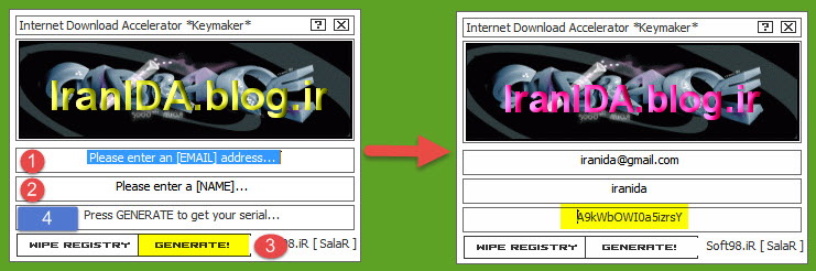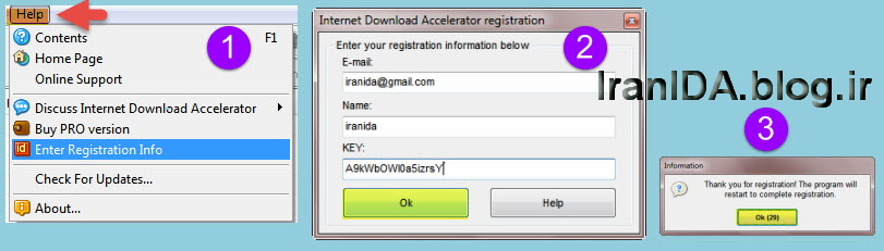 در پنجره registration اطلاعاتی که در محیط کیجن تولید کردید را وارد کنید و گزینه Ok را انتخاب کنید. برای مثال در قسمت Email عبارت iranida@gmail.com، در قسمت Name عبارت iranida و در قسمت KEY سریال A9kWbOWI0a5izrsY را وارد کنید. همچنین در پتجره Information هم بر گزینه Ok کلیک کنید تا نرم افزار بسته شود. شما برای استفاده مجدد از نرم افزار IDA باید دوباره آن را راه اندازی کنید.