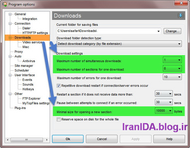 در قسمت Maximum number of sections for download از منوی کشویی تعداد را روی عدد 8 تنظیم کنید. در قسمت Minimal size for opening a new section با استفاده از منوی کشویی بر روی مقدار 10000bytes تنظیم کنید.