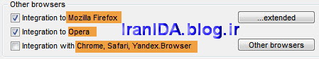 در همین مسیر به قسمت integration برید و در قسمت Other browsers متناسب با نوع مروگرهایی که در سیستم دارید، تیک گزینه ها را بزنید. بدین صورت رابط کاربری IDA، در کلیک راست این مرورگرها فعال می شود.