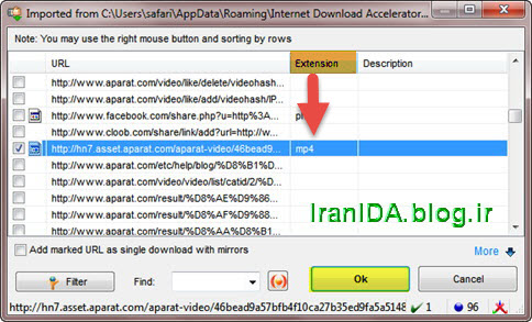 راه حل سوم: با کلیک راست بر صفحه مرورگر و گزینه Download all with IDA را انتخاب کنید. بر صفحه ای که ظاهر می شود، کلیک راست کنید و گزینه Unmark All را انتخاب کنید، بدنبال فایلی با پسوند ویدئویی (مثل mp4، flv و ...) باشید. اگر فایل مورد نظر را یافتید، تیک آن را بزنید و بر گزینه Ok کلیک کنید، تا دانلود شروع شود.