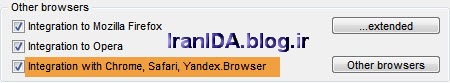 پس از نصب جدیدترین نسخه افزونه، مشاهده می کنید آیکن آن در مرورگر کروم فعال شده. حالا از مرورگر کروم و خود نرم افزار IDA بطور کامل خارج شوید (دقت کنید در Taskbar هم نرم افزار IDA فعال نباشد). سپس مجددا نرم افزار IDA راه اندازی کنید و از منوی Tools گزینه Options را انتخاب کنید. در قسمت General گزینه Intergration انتخاب کنید. در قسمت Other browsers بررسی کنید حتما تیک گزینه Integration with Chrome,Safari,Yandex.Browser فعال باشد.