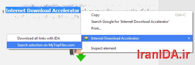 - اگر قسمتی از متن را انتخاب کنید. با کلیک راست بر قسمت انتخاب شده (highlight) و انتخاب گزینه "Find selection on MyTopFiles.com" می توانید آن عبارت را در سایت MyTopFiles جستجو کنید و لینک دانلود را بدست آورید.