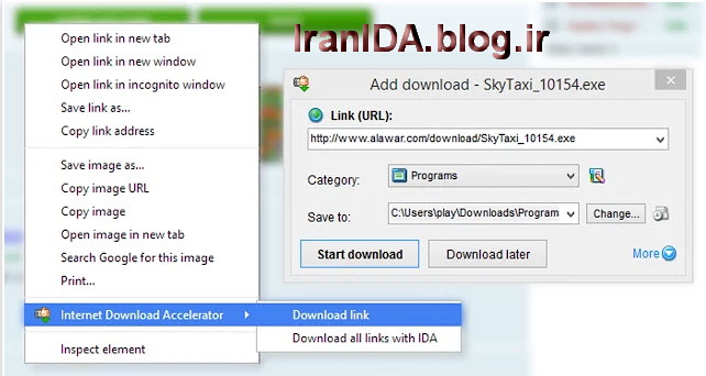 - به منوی کلیک راست (context menu) مرورگر کروم دو گزینه Download with IDA و Download all with IDA را اضافه می کند. با استفاده از اولی می توانید یک لینک را توسط IDA دانلود کنید. با استفاده از دومی می توانید تمام لینک های موجود در صفحه را دانلود کنید.