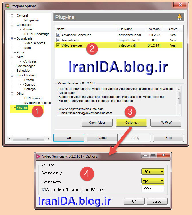 نکته: با طی مسیر زیر در نرم افزار IDA و با استفاده از تنظیمات پلاگین video Service می توانید کیفیت دانلود ویدئو (کیفیت MP3 تا 4K) و فرمت دانلود را (Flv و MP4 و Webm) را از سایت یوتیوب و... مشخص کنید.