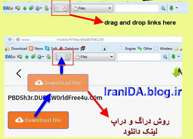 افزونه IDAbar یک نوار ابزار به مرورگر فایرفاکس اضافه می کنید. مهمترین بخش این نوار افزار قابلیت drag and drop links here که میتونه در اکثر جاهایی که امکان دانلود از طریق کلیک راست مرورگر وجود نداره، موثر باشه. به این شکل که فقط کافیه لینک مورد نظر را بر روی ابزار drag and drop links here دراگ و دراپ کنید. در شکل زیر، در کادر قرمز رنگ محل این ابزار نشان داده شده.