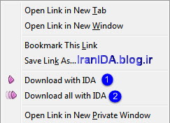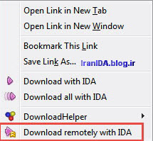 - به منوی کلیک راست (context menu) مرورگر فایرفاکس دو گزینه Download with IDA و Download all with IDA را اضافه می کند. با استفاده از اولی می توانید یک لینک را توسط IDA دانلود کنید. با استفاده از دومی می توانید تمام لینک های موجود در صفحه را دانلود کنید.