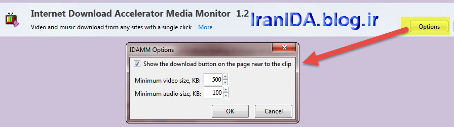 با مراجعه قسمت Add-On مرورگر فایرفاکس و انتخاب قسمت Option افزونه Media Monitor شما می توانید تنظیماتی را که مایلید برای حداقل حجم ویدئو یا موزیکی، که افزونه برای آن فعال شود، را انجام دهید.