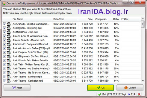 همانطور که مشاهده می کنید، IDA محتویات درون فایل Zip را به شما نشان می دهد. با کلیک راست بر صفحه و انتخاب گزینه Unmark all تمام موزیک ها را از حالت انتخاب خارج کنید. حالا کافیست تیک هر کدام از موزیک هایی که می خواهید دانلود کنید را بزنید و بر دکمه OK کلیک کنید تا دانلود آنها شروع شود.