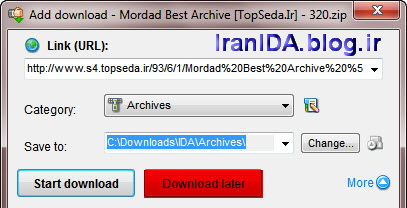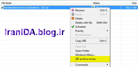 فرض کنید می خواهیم بخشی از آهنگ های مرداد 93 را از فایل Zip به حجم 832 مگابایت دانلود کنیم. بدین منظور بر لینک زیر کلیک راست کنید و گزینه Download with IDA را انتخاب کنید. سپس در جعبه دانلود حتما بر گزینه Download later کلیک کنید.