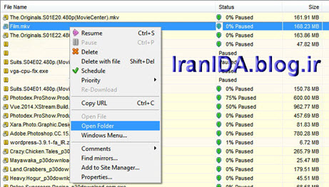 برای پشتیبان گیری از دانلود ناتمامی با نام Film.mkv فقط کافیه شما در لیست دانلود نرم افزار، مطابق شکل زیر روی فایل Film.mkv کلیک راست کنید و گزینه Open Folder رو انتخاب کنید تا به محل ذخیره فایل در هارد دیسک برید. در اونجا به دنبال فایل Film.mkv.IDAf باشید.