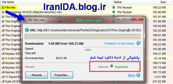 نکته خیلی مهم: نرم افزار IDA به شرطی دوباره فرآیند دانلود رو از درصدی که متوقف شده ادامه می دهد که سروری که ازش دانلود می کنید قابلیت Resume (ادامه دانلود نیمه تمام) رو داشته باشد (در غیر اینصورت دوباره از صفر درصد باید دانلود رو شروع کنید.) برای فهمیدن این موضوع کافیه رو فایل در لیست دانلود دو بار کلیک کنید تا جعبه دانلود فایل ظاهر شود. اگر مطابق شکل زیر، در کادر قرمز رنگ مقابل کلمه Resume کلمه Supported رو دیدید، مطمئن می شوید که سرور قابلیت Resume را پشتیبانی می کند و شما می توانید دانلود های نیمه تمام رو از درصدی که متوقف کردید، ادامه دانلود دهید.
