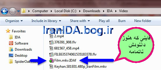 مطابق شکل زیر فایل Film.mkv.IDAf با پسوند IDAf رو بداخل فلش یا هر مسیر دلخواه دیگری کپی کنید. حالا اگه در کامپیوتر دیگه بخواهید فرآیند دانلود رو ادامه بدید کافیه رو فایل Film.mkv.IDAf دو بار کلیک کنید، تا فرآیند دانلود مجددا شروع شود و فایل از درصدی که قبلا دانلود متوقف شده دوباره شروع شود.