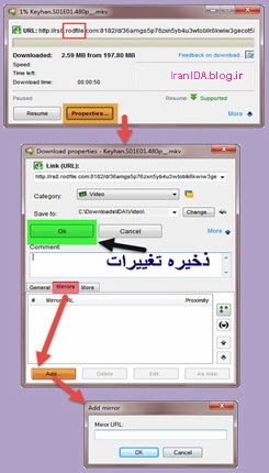 برای این منظور ابتدا دانلود رو از سرور Rodfile به عنوان لینک اصلی شروع می کنیم. حالا برای اینکه لینک های کمکی دو سرور UploadBaz و HexUpload در پنجره دانلود وارد کنیم، بر گزینه properties کلیک می کنید و در پنجره جدیدی که باز می شود، به تب Mirros می رویم. برای اضافه کردن هر کدام از لینک های کمکی کافی است بر دکمه Add کلیک کنیم و سپس تائید نماییم. در انتها برای ذخیره تمام تغییرات بر روی گزینهOK کلیک می کنیم.