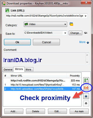 اگر مطابق شکل زیر در تب Mirros دقت کنید، با کلیک بر آیکن Check proximity یا Ping نرم افزار IDA اعدادی بر حسب میلی ثانیه (ms) را در ستون proximity نشان می دهد (پینگ به زبان ساده , زمان رفت و برگشت دیتا از سیستم شما به سیستم دوم (سرور) هست.که هدفش هم تست میزان دسترسی شما به سیستم دوم یا همون سرور هست). البته توصیه می کنم چند بار روی این آیکن کلیک کنید تا به اعداد دقیق تری برسید. جالب است بدانید هر چه عدد proximity لینک کوچکتر باشد، آن لینک سرعت دانلود بیشتری را در اختیار شما قرار می دهد.
