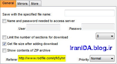 نکته مهم: اگر فایلی برخلاف مثال بالا فقط در یک سرور مثلاً RodFile بارگذاری شده و لینک دانلود مثلاً برای 24 ساعت معتبره و دانلودتون مثلاً تا 90 درصد رسیده، ولی لینک دانلود بعلت عبور از زمان مجاز منقضی شده؛ شما می توانید لینک جدید رو دوباره با مراجعه به همان سرور یعنی RodFile دریافت و بصورت دستی جایگزین لینک قبلی کنید تا 10% بقیه هم دانلود بشه. ( اگر آدرس سرور را برای مراجعه مجدد نمی دانید، مطابق شکل زیر به تب General مراجعه کنید و در لینک مقابل عبارت Referer را کپی کنید و در آدرس بار مرورگر خود Paste کنید.)