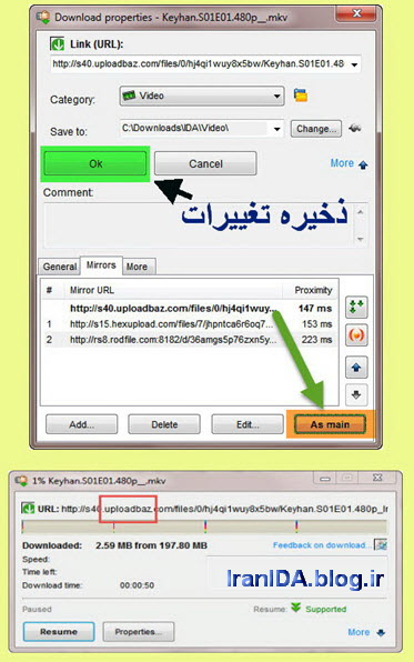 در این مثال براساس اعداد ستون proximity و با استفاده از گزینه As main، من سرور UploadBaz را با عدد 147ms بجای سرور RodFile با عدد 223ms بعنوان سرور اصلی و سریعترین سرور انتخاب کردم و لینک های کمکی را هم با فلش های بالا و پایین براساس سرعت شان، دوباره مرتب کردم و در نهایت برای ذخیره تغییرات بر گزینه Ok کلیک کردم.