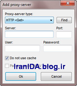 برای اضافه کردن هر پراکسی سرور بر گزینه Add کلیک می کنید. در پنجره ای که باز می شود، سرور (Server) و پورت (Port) مرد نظر را وارد می کنید. همچنین، در صورتی که برای استفاده از این پراکسی سرور نیازمند نام کاربری و رمز عبور هستید، Username و Password را وارد کنید و بر گزینه Ok کلیک کنید. جالبه بدانید، شما می توانید برای نرم افزار IDA بی نهایت پراکسی سرور وارد (Add) کنید.