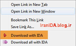 برای اینکار در تمام مرورگرها کافیست بر لینک دانلود کلیک راست کنید و گزینه Download with IDA را انتخاب کنید تا پنجره دانلود باز شود. برای دانلود بر گزینه strat کلیک کنید.